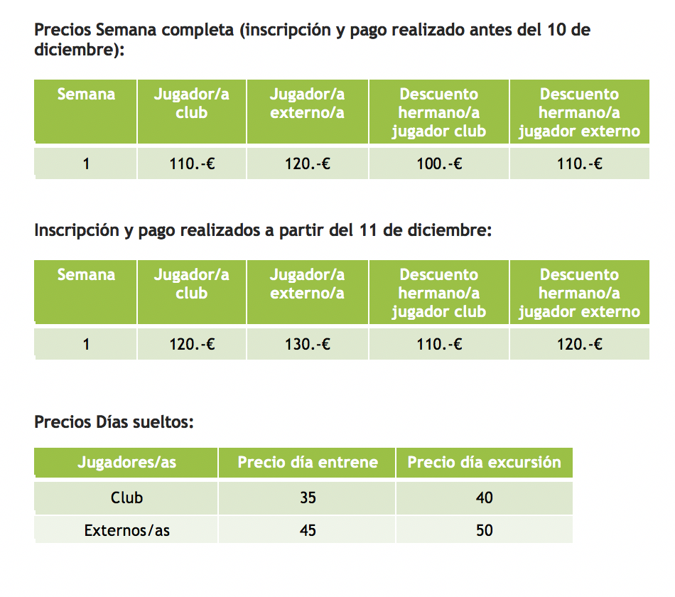 • Precio especial para jugadores del club y descuentos para hermanos.