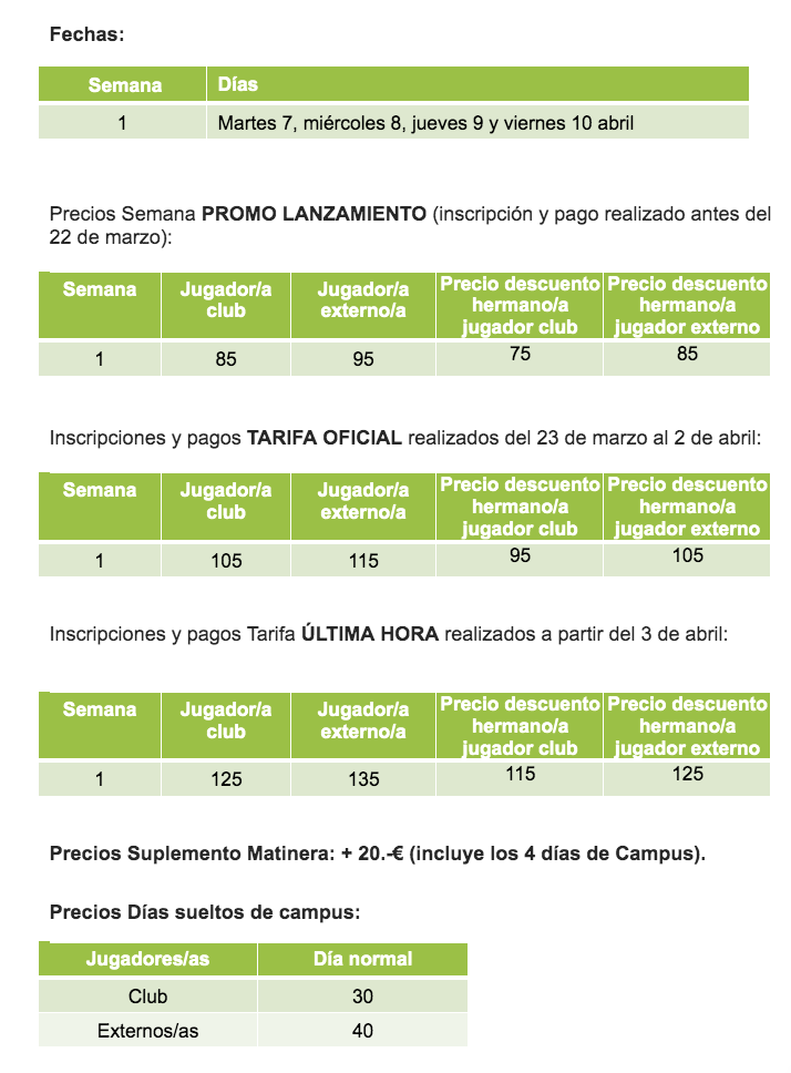 - Precio especial para jugadores/as del club y descuentos para hermanos/as.